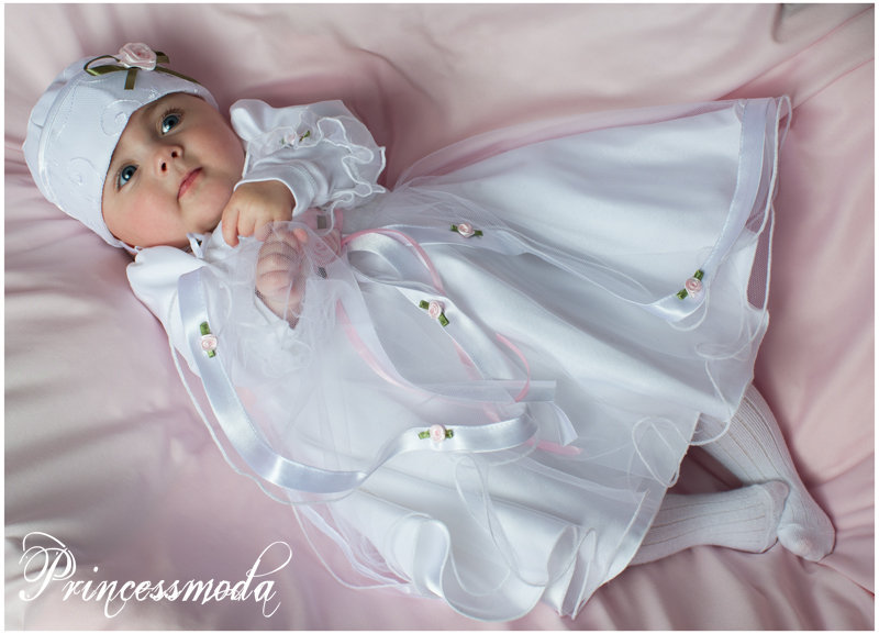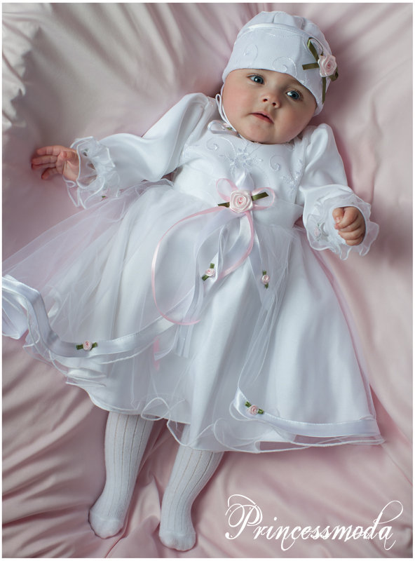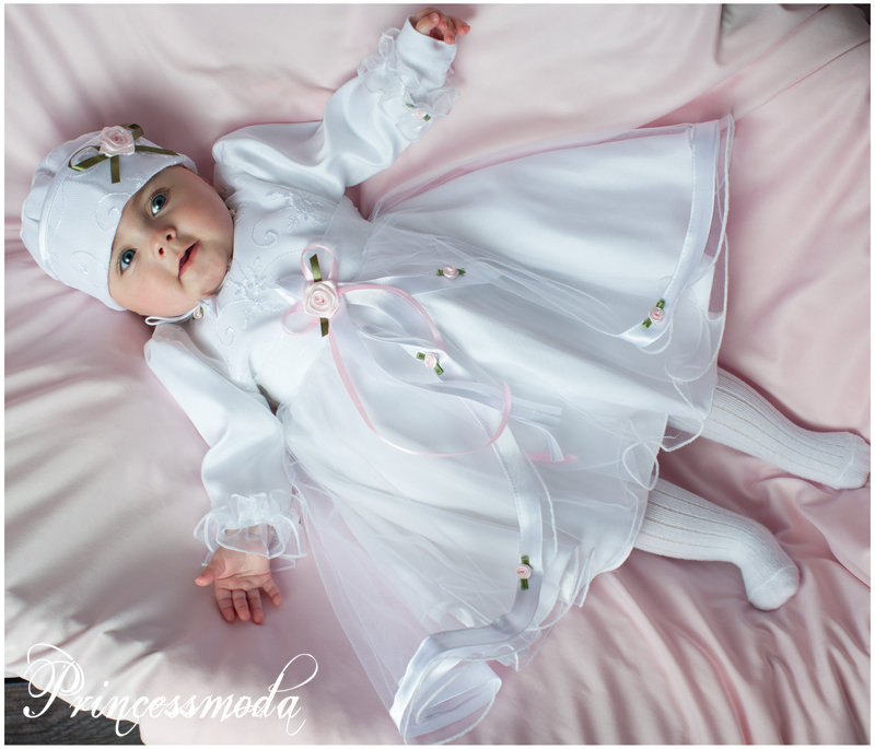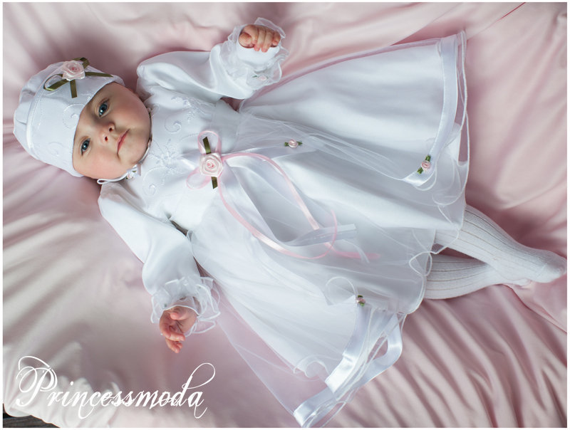 Das Taufkleid ist einzigartig. Dezente und hochelegante Details, wie die Abschlüsse aus Satin, die traumhaften Stickereien und die vielen kleinen Röschen verleihen dem Kleid unvergleichliche Schönheit.