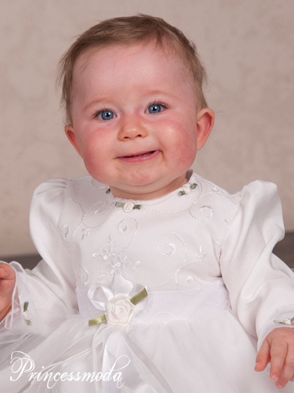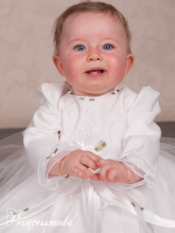 Dezente und hochelegante Details, wie die Abschlüsse aus Satin, die traumhaften Stickereien und die vielen kleinen Röschen verleihen dem Kleid unvergleichliche Schönheit!