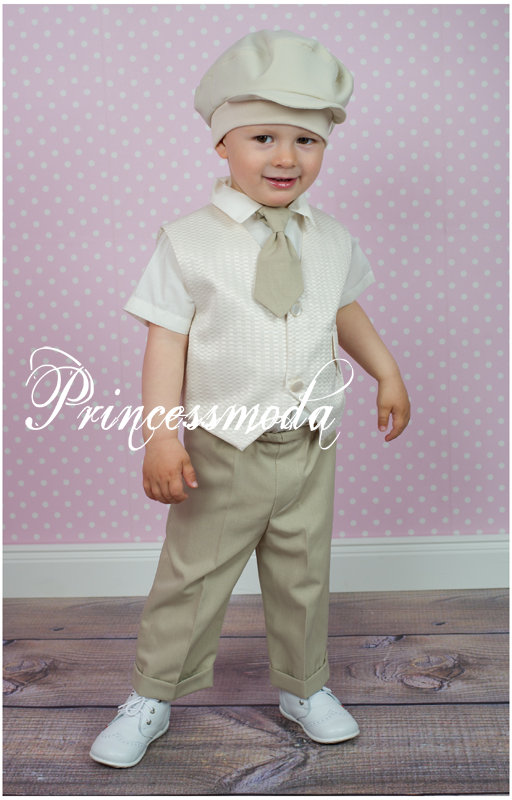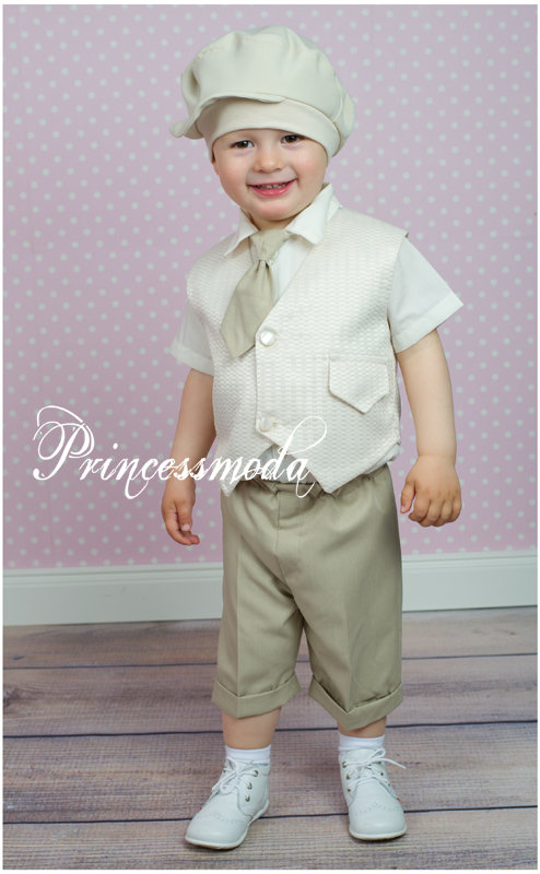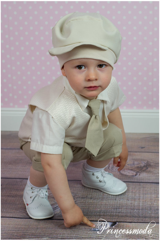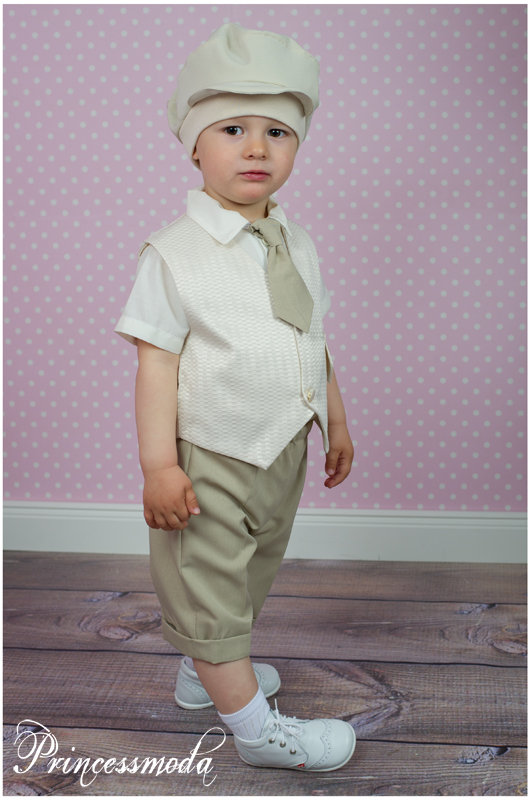 Der perfekte Sommer-Taufanzug! In weichem Cremeton gehalten... Traumhaft elegante Weste mit Krawatte und dazu eine schicke Mütze und ein kurzärmeliges Hemd... Der Clou: 2 Hosen gehören zu diesem Set... Eine 3/4 Hose für die heißen Tage und eine lange, falls es kühler sein sollte (eventuell in der Kirche)...