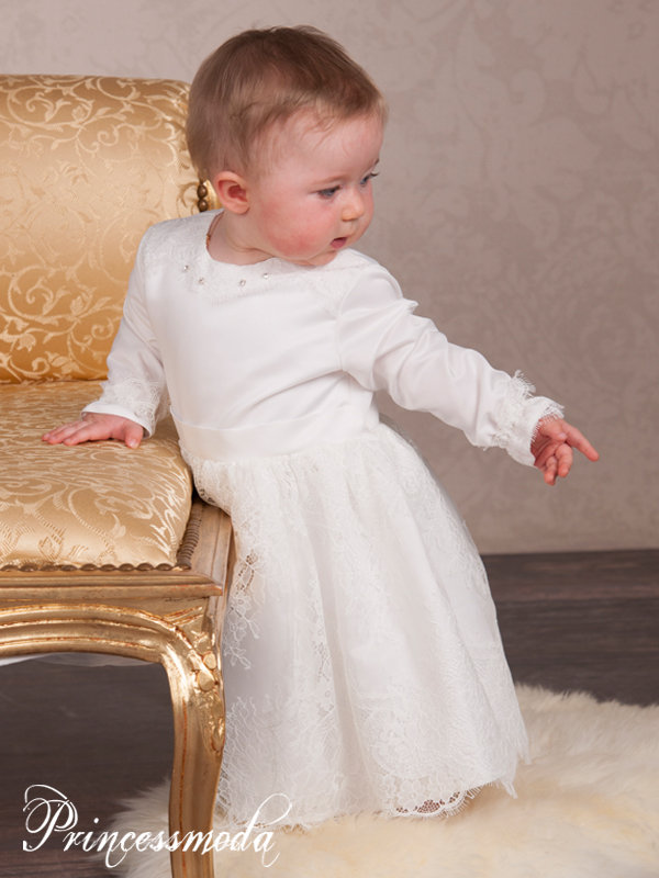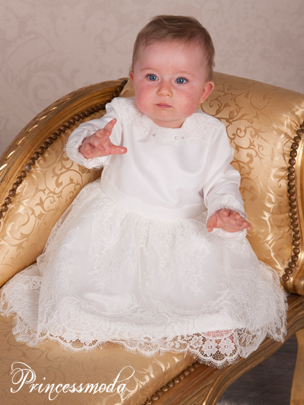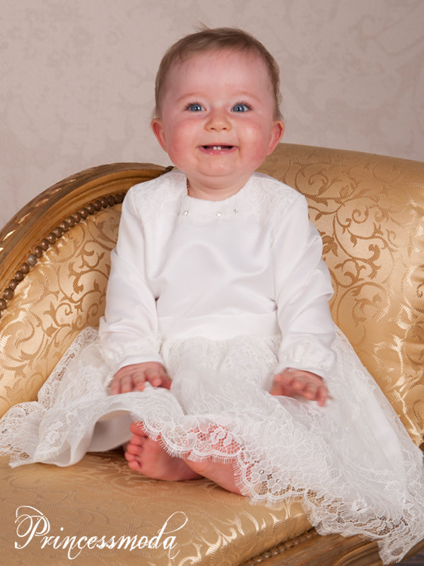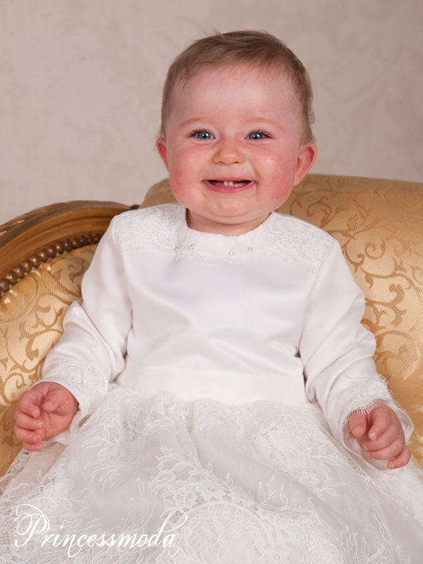 Dieses bezaubernde Taufkleid wurde aus sehr hochweritegen Stoffen, wie die einmalig schöne und zarte Spitze oder das Brautsatin gerfertigt.